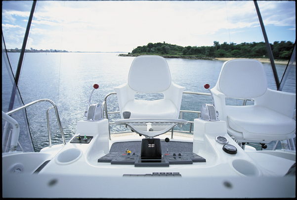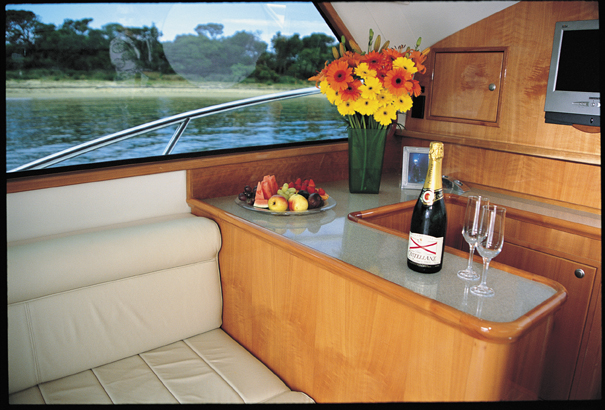 The whole atmosphere of the interior is warm and inviting; quality fabrics, plush pile carpets, Cherry wood cabinets and bulkheads throughout. Add the optional leather and the interior resembles that of a 5 star hotel equal to the best vessels in the world.